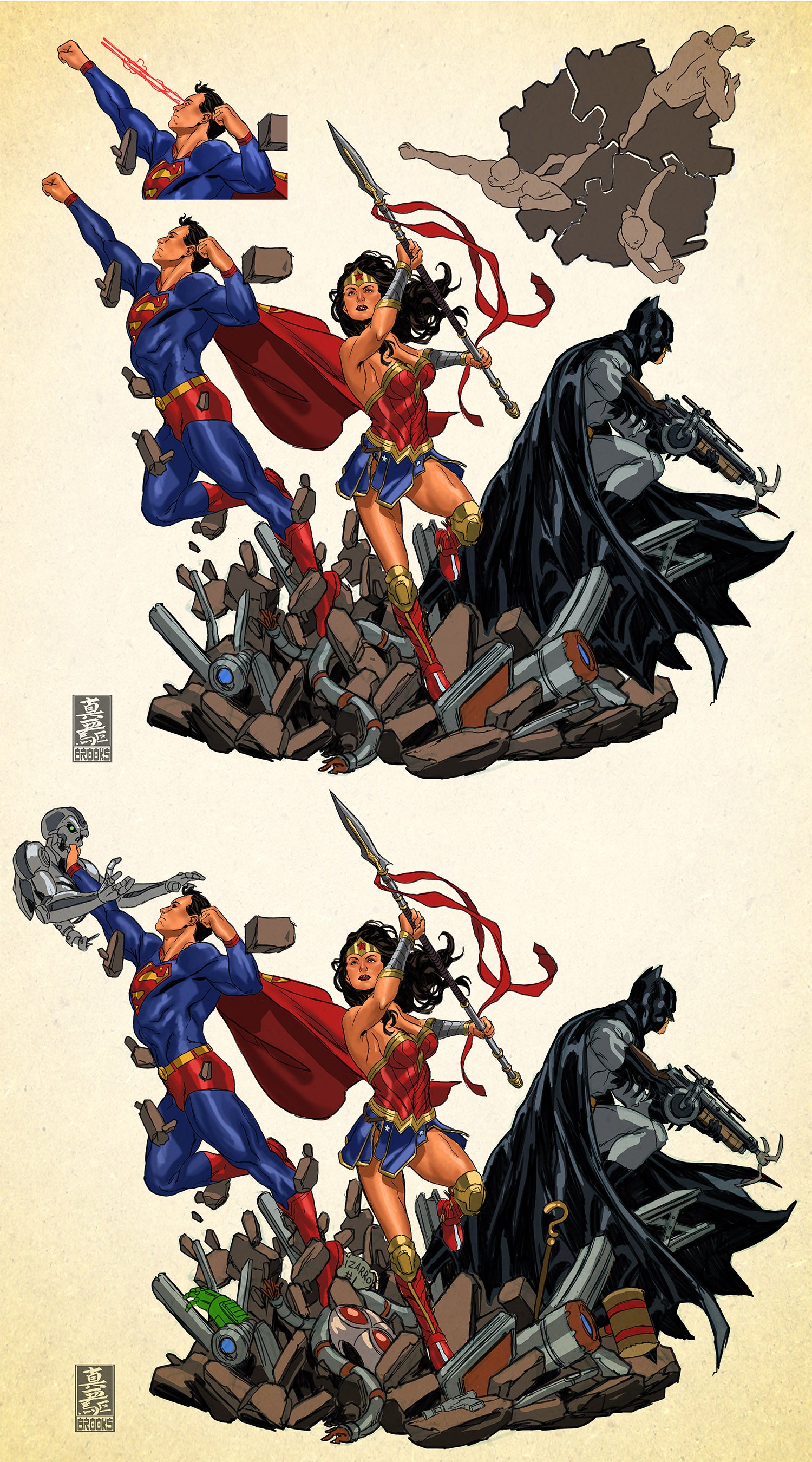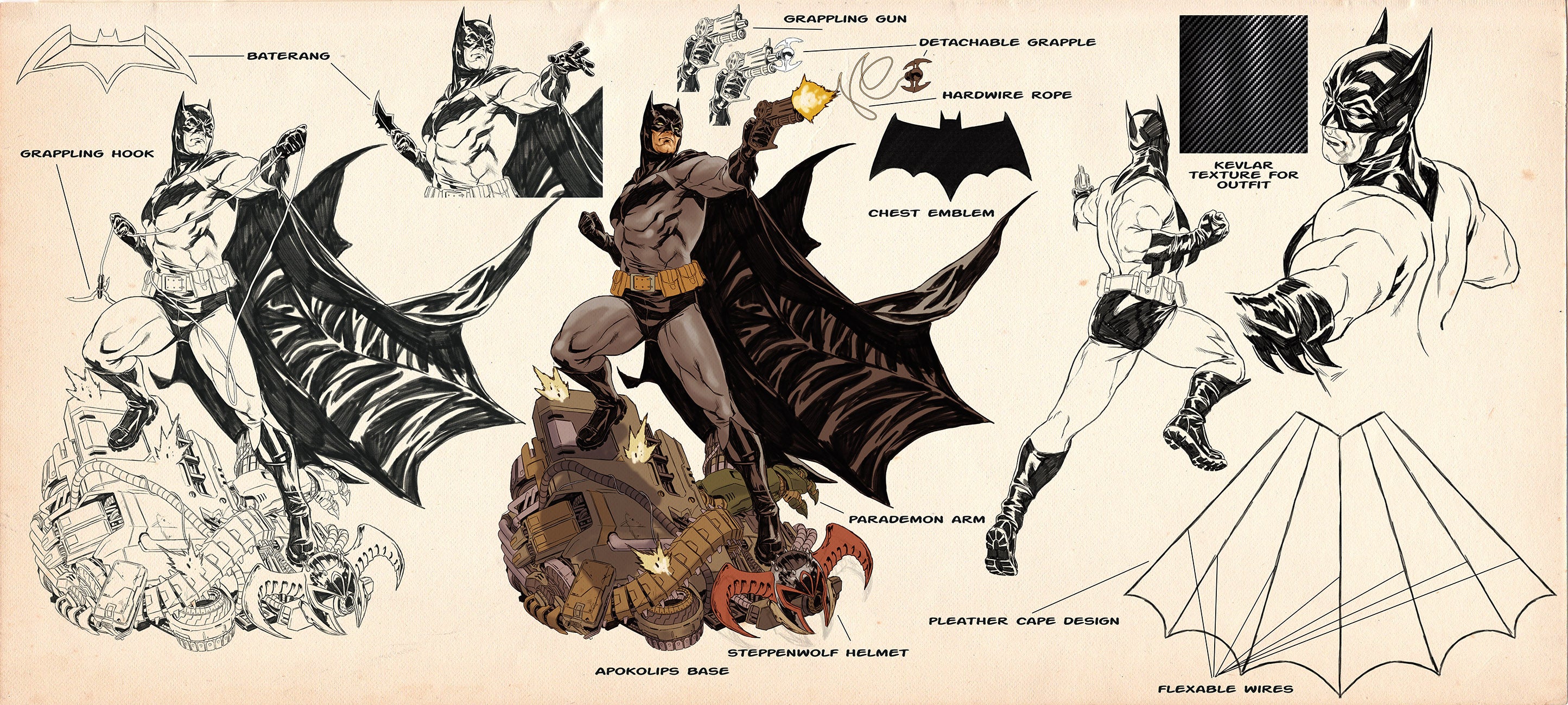 In this scene, Batman is seen doing what he does best. Always ready for whatever is thrown at him, Batman’s mastery of the martial arts coupled with his extremely high levels of strength and endurance are on full display as he is seen standing within battle-damaged cybernetic ruins, all while taking on Darkseid’s Parademons on Apokolips with a scowl on his face.