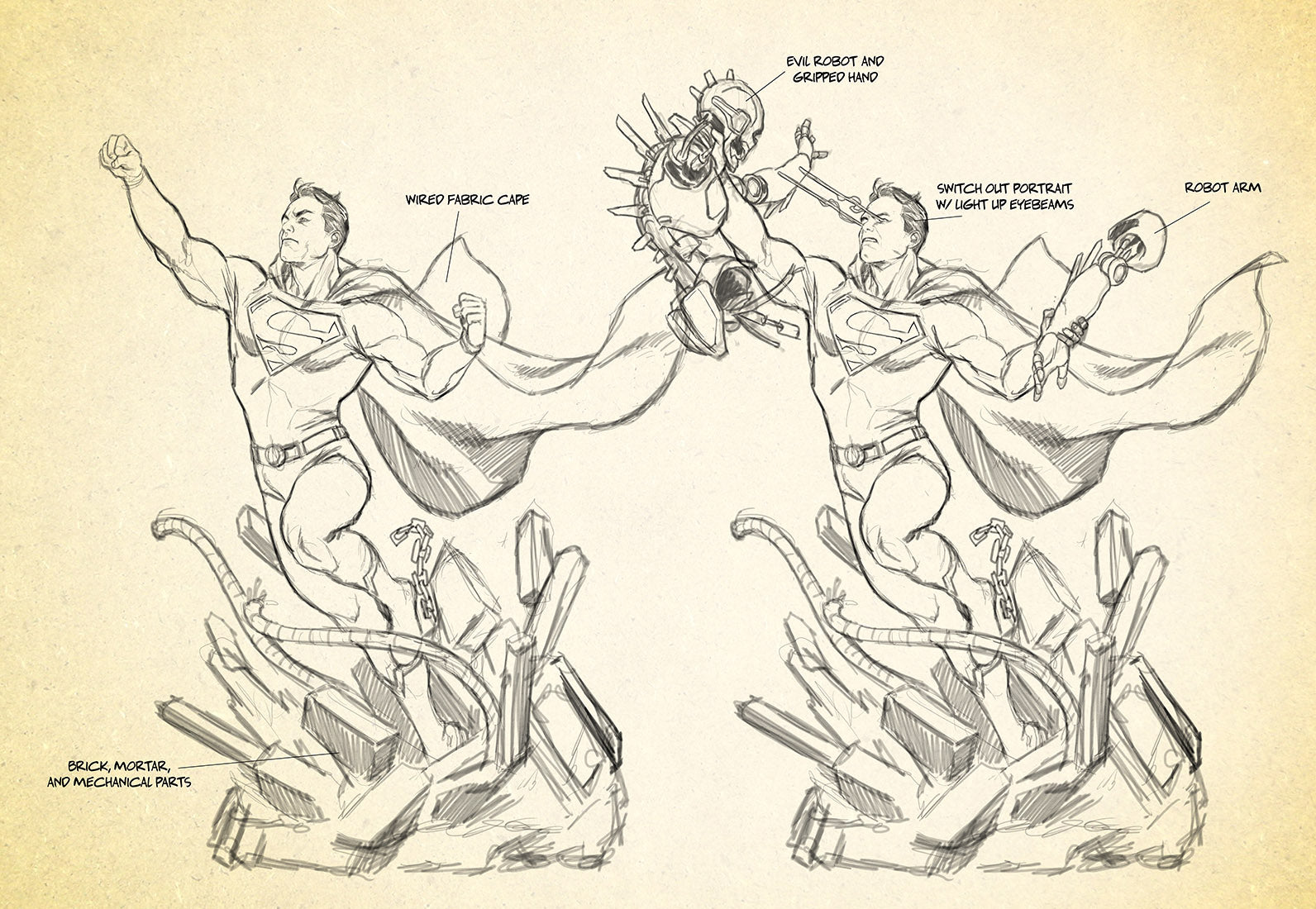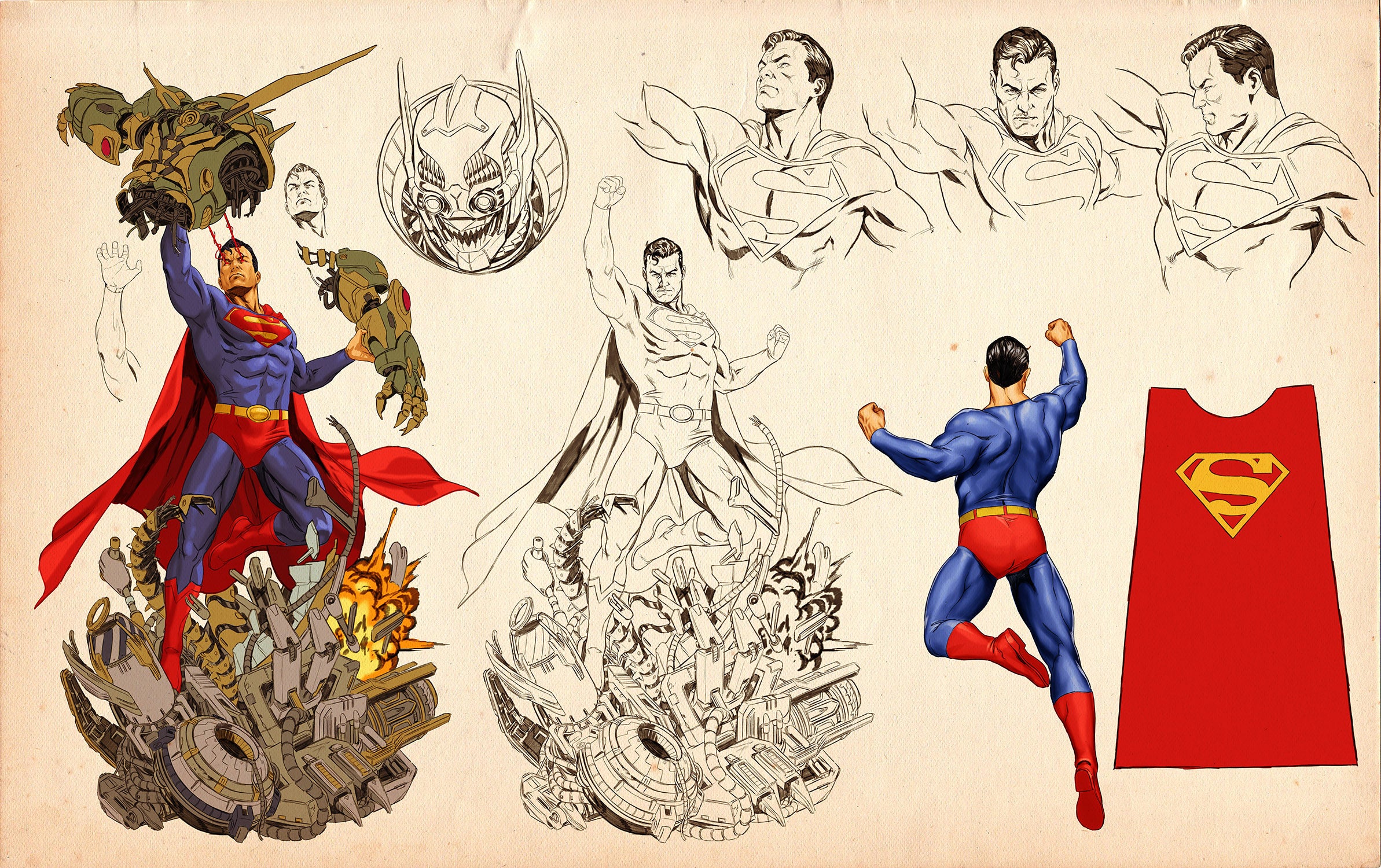 Set on the planet Apokolips, Superman is seen mid-battle against Darkseid’s shock troops, the Parademons, within cybernetic ruins and explosive debris.